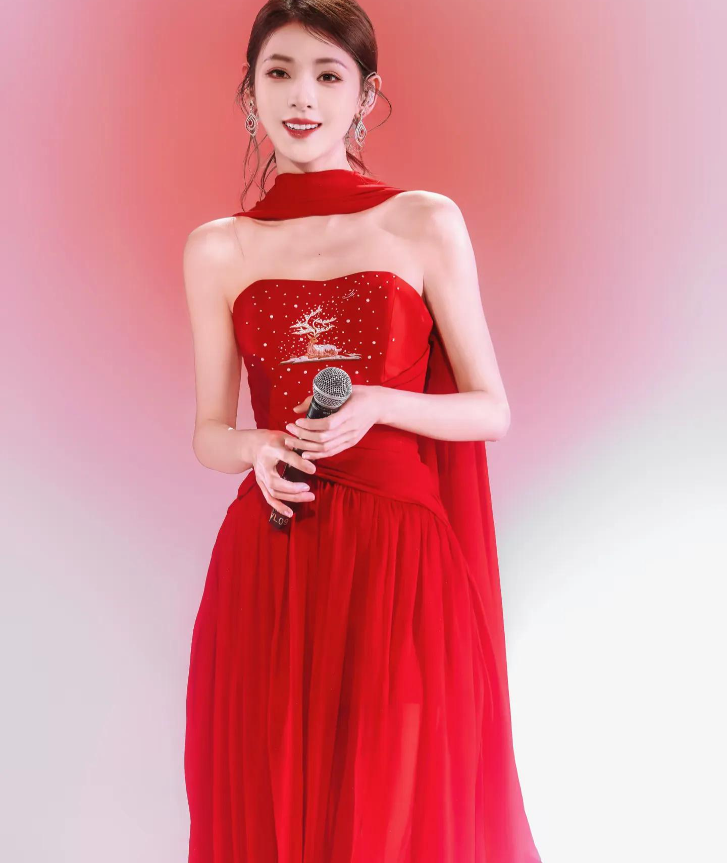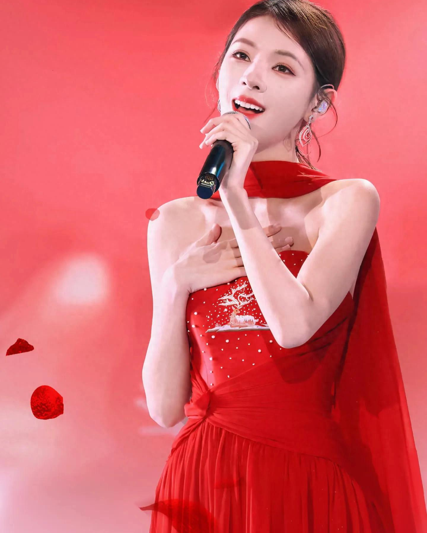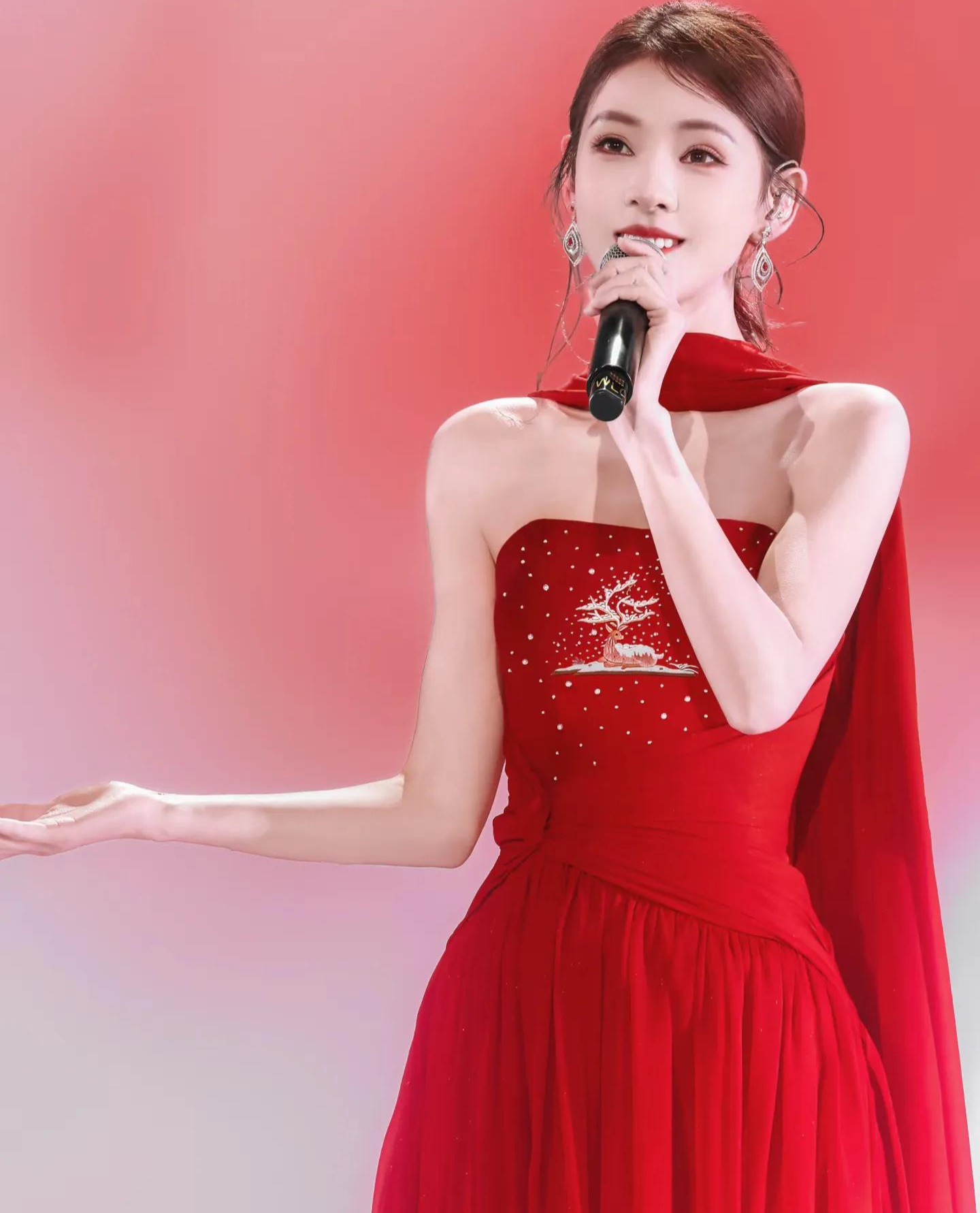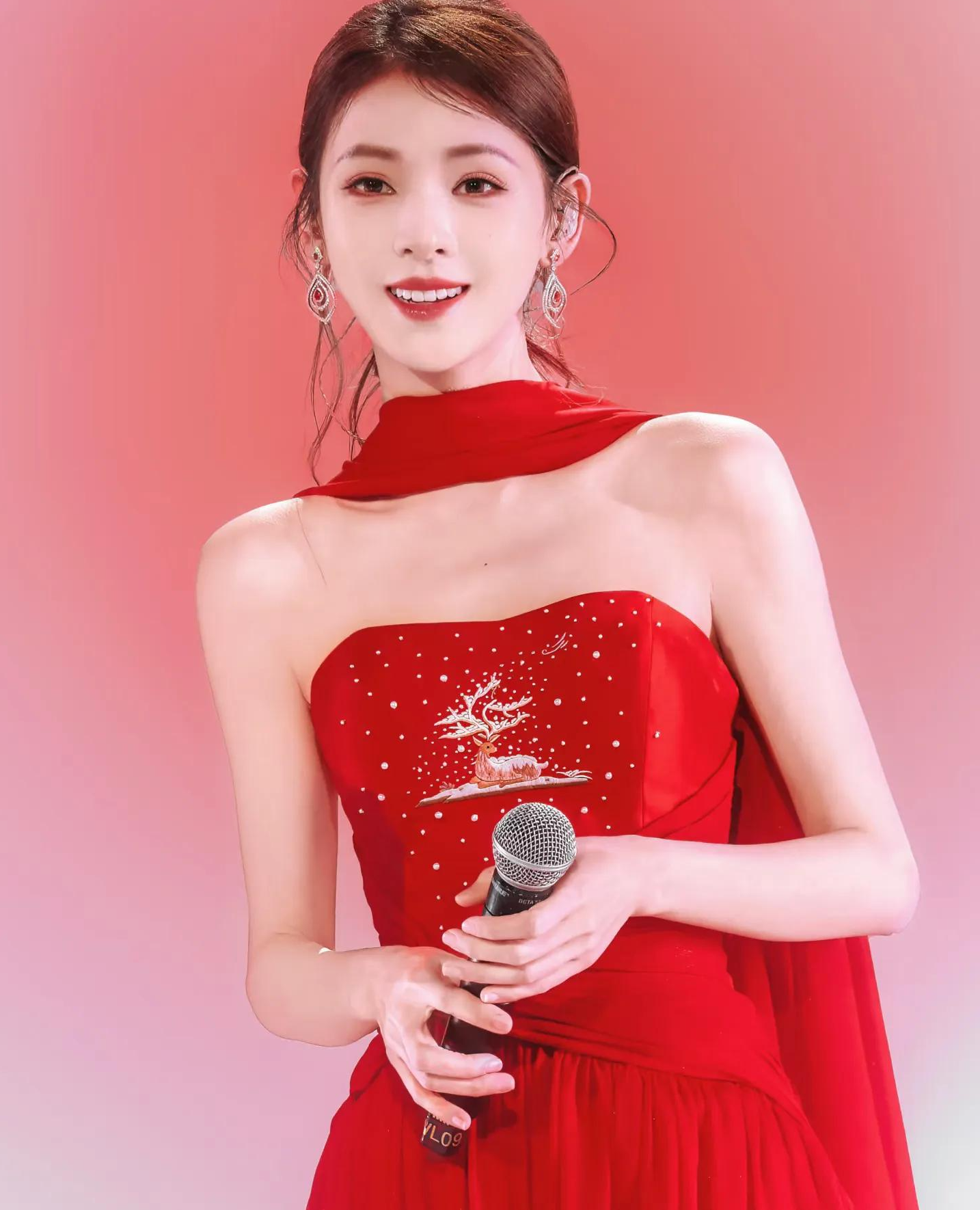 镜头拉近,裙身点缀的细闪与精致刺绣清晰可见,妆容明艳大气,红唇配红裙,眉眼间尽是温婉与灵动。她手持话筒深情献唱,歌声温柔又有力量,气息平稳,情感饱满,完全打破了“只靠颜值”的刻板印象。