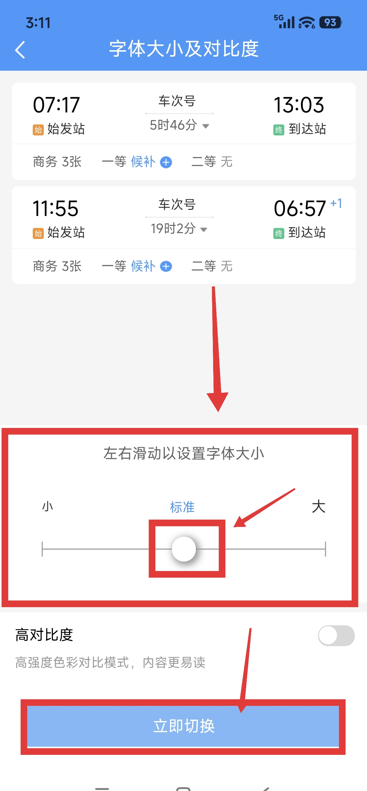 3.到字体大小及对比度页面后,用手指(左右滑动以设置字体大小),然后点击【立即切换】即可了。