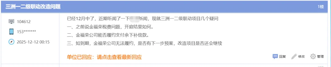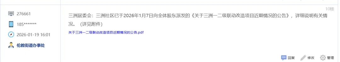 对此,三洲居委会回复道,三洲社区已于2026年1月7日向全体股东派发的《关于三洲一二级联动改造项目近期情况的公告》,详细说明有关情况。