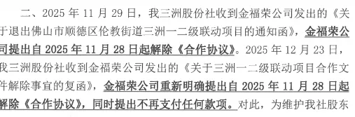 一是金福荣公司宣布退出三洲一二级联动项目改造。2025年11月29日,三洲股份社收到金福荣公司发出的《关于退出佛山市顺德区伦教街道三洲一二级联动项目的通知函》,金福荣公司提出自2025年11月28日起解 《合作协议》。2025年12月23日,金福荣公司重新明确提出自2025年11月28日起解除《合作协议》,同时提出不再支付任何款项。