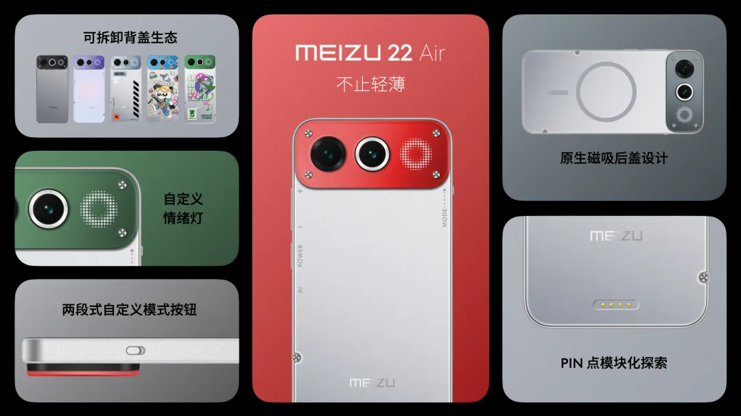 魅族22Air不仅代表着单薄的机身,更是代表了潮流艺术,形态创新,设计革命。可拆卸背盖生态,自定义情绪灯,两段式自定义模式按键,以及全新定制系统主题,外接模块化探索,由内到外,定义不被设限的形态,这次,不止轻薄,不被定义的,才是22Air。