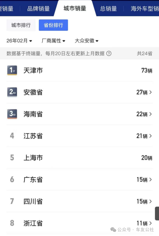 与众是大众安徽面向中国新能源汽车市场打造的纯电汽车品牌,是大众集团在华电动化布局的核心载体之一。2024年7月,与众品牌首款量产车型与众06正式上市,但上市至今,与众06的市场表现始终不及预期。公开数据显示,自上市以来,与众06累计销量仅1万余辆;其中2026年2月,该车全国单月销量仅200余辆,其中销量最多的地区是天津市,销量为73辆,第二名是大众安徽总部所在地安徽省也仅有27辆。