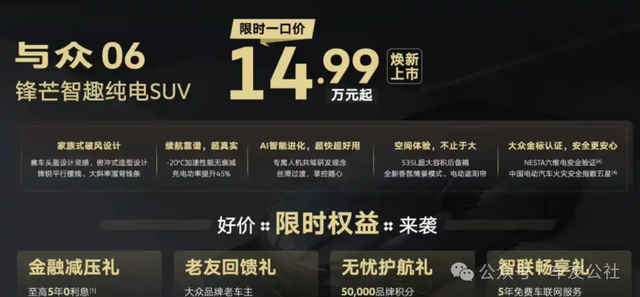 与众06上市后先后推出两轮大幅降价政策。公开信息显示,2024年11月,与众06官宣降价4万元;2025年上海车展期间,该车再度降价2万元,限时一口价14.99万元起,部分区域叠加置换权益后,车辆落地价低至12万元。但两轮大幅降价并未带动与众06的销量出现显著提升。