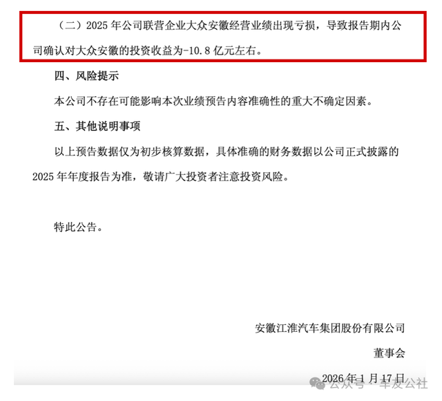 江淮汽车于2026年1月17日发布的《安徽江淮汽车集团股份有限公司2025年年度业绩预亏公告》中明确描述:“2025年公司联营企业大众安徽经营业绩出现亏损,导致报告期内公司确认对大众安徽的投资收益为-10.8 亿元左右。”江淮汽车持有大众安徽25%股份,由此测算大众安徽年度总亏损应为10.8亿元*4,也就是43.2亿元。大众安徽去年全年共卖了9000多辆,平均每卖一辆车就要亏掉45万左右。