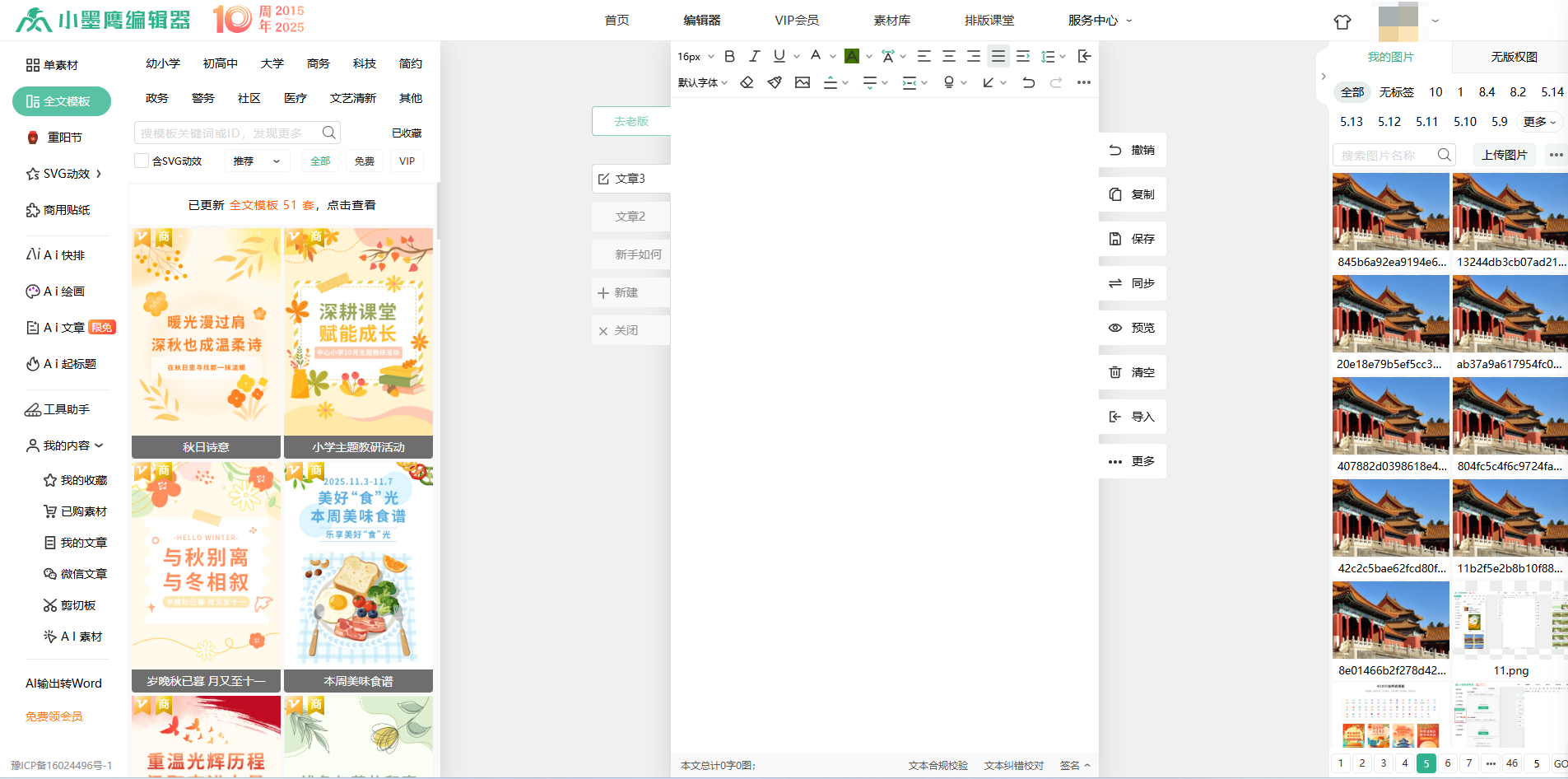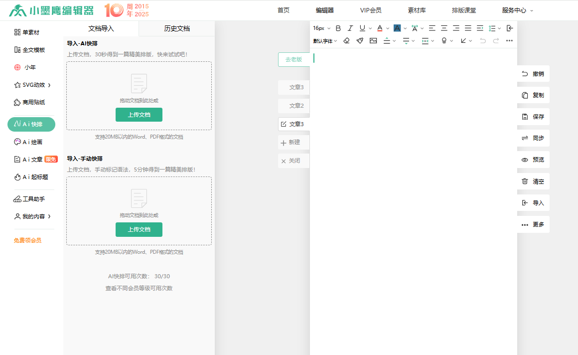 它的素材模板每日更新,日常推文、节日特辑、活动通知等各类模板全覆盖,关键是免费素材超多,排版时不用到处找素材,直接挑模板改改内容就好;AI快排功能更是刚需,把写好的文档导入,就能自动调整字体、段落和间距,几秒钟完成基础排版,比手动调整省太多时间。