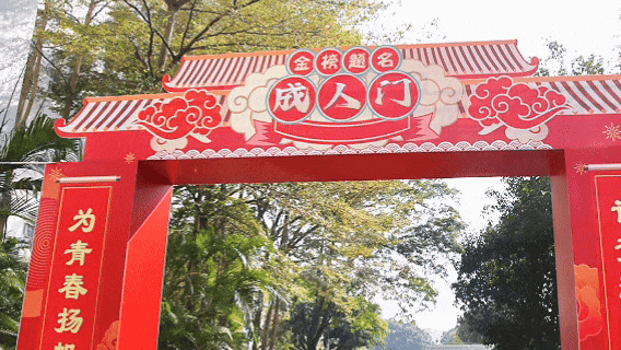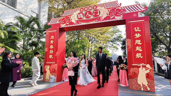 轻柔舒缓的背景音乐为仪式拉开序幕,象征着蜕变与超越的成人门巍然矗立,见证着少年们跨越通向世界的大门。