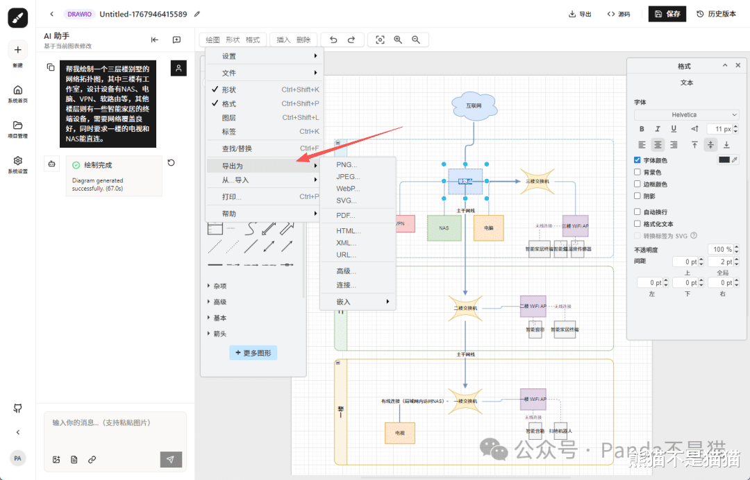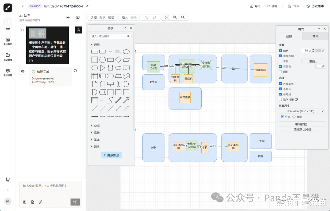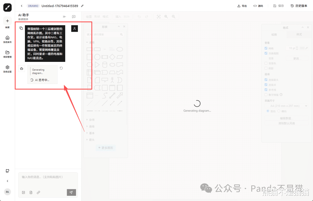 这里熊猫直接让它帮我生成一个三层楼别墅的网络拓扑图,明确告诉它一些需求,这时候会弹出制图界面,AI会先理解你的需求,随后一步一步拆解他,最后会在右侧的制图区生成你想要的拓扑图,这个过程非常快。