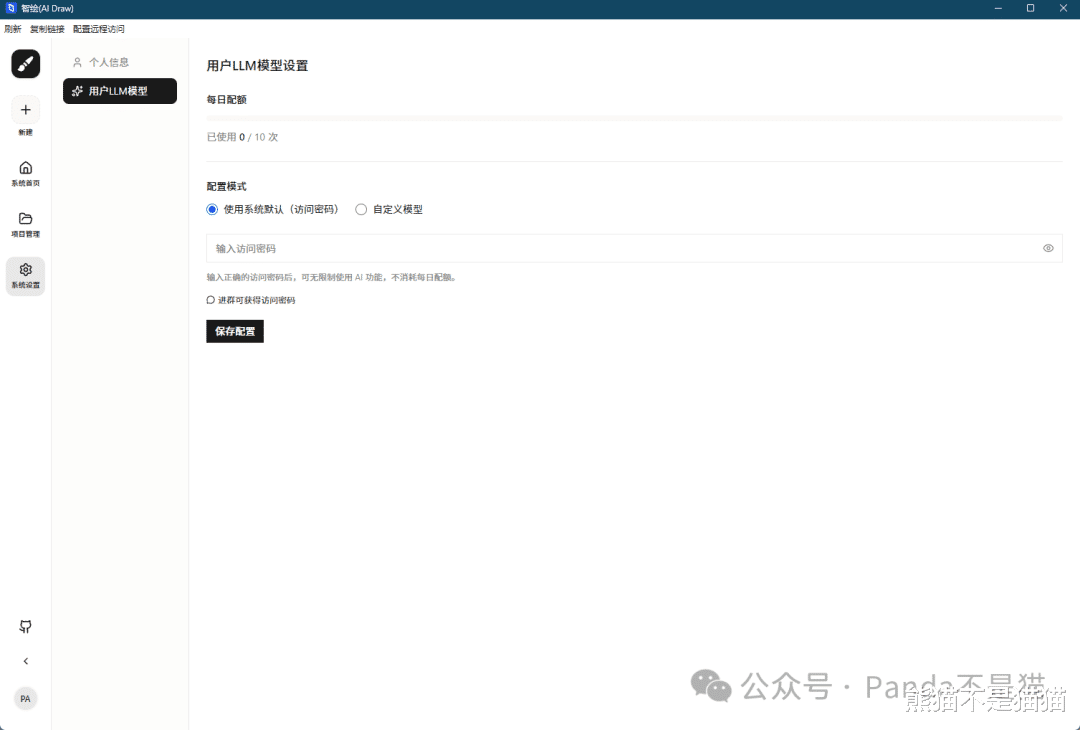 首次使用需要我们注册并登录账号,不然就是游客模式,会有所限制,仅支持十次的配额,且不能自定义模型。登录之后在用户LLM模型这里就可以设置自定义模型,自定义之后这个配额就无限制了。