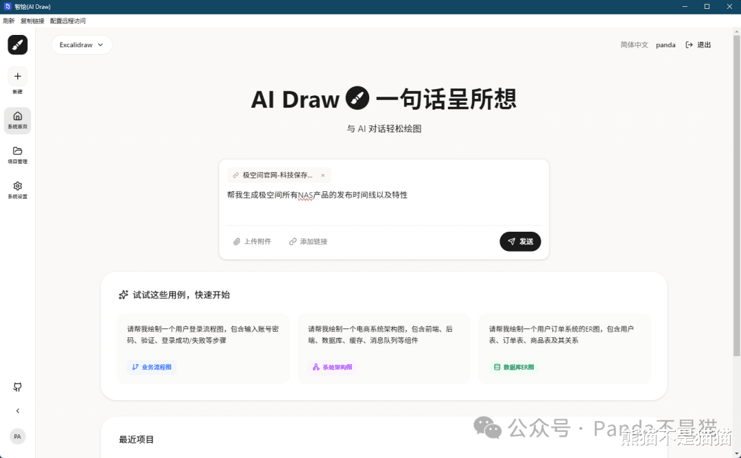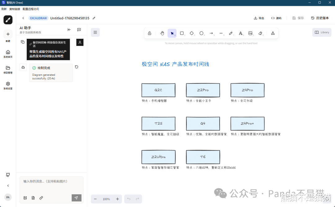 除了玩NAS会用到的网络拓扑图,日常我们刷各大网站也会遇到各种文章,这时候也可以直接通过链接将其生成为图表方便我们更好理解。例如这里我输入极空间的官网,随后让他直接帮我生成极空间的产品发布时间线。