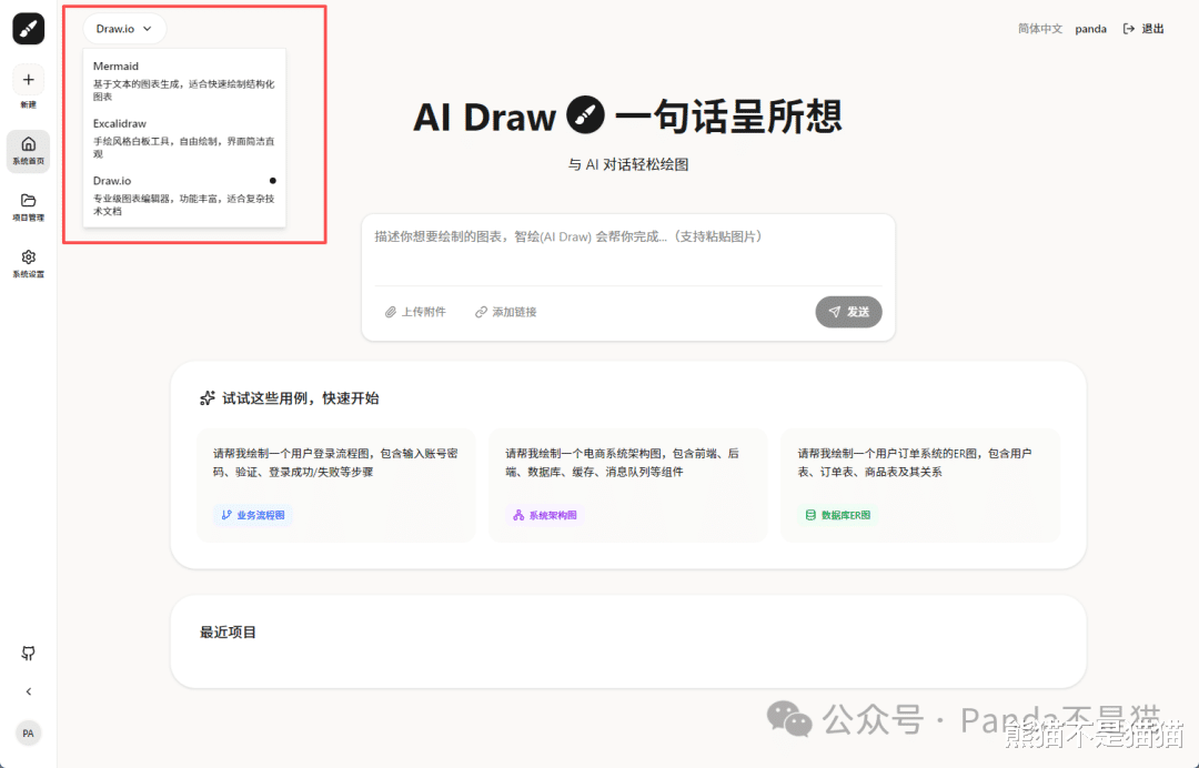 设置完成之后回到首页,首先看项目的左上角,项目支持三种绘图引擎,分别是Mermaid、Excalidraw以及市面知名的Draw.io,其中Mermaid主要作用域流程图、时序图等,Excalidraw更适合手绘风的图标,简洁直观,而Draw.io则是专业需求比较多了,也是目前最流行的图表制作引擎。