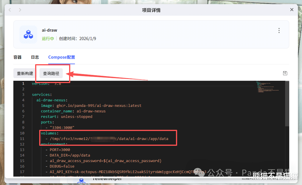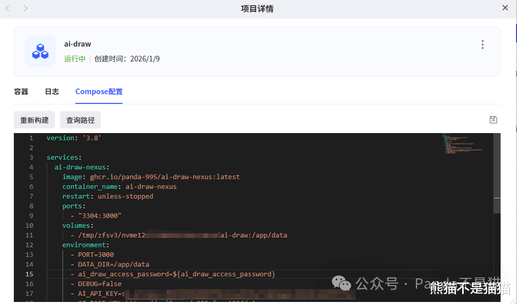 熊猫整理好的Compose代码如下,打开极空间的Docker,在Compose中选择新增项目,随后复制即可。其中的路径、端口以及API等信息需要自行进行修改。