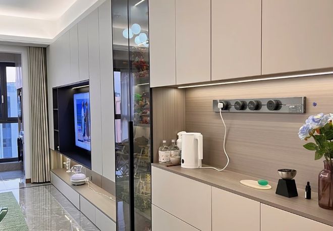 轨道式插座的现代感也很强,有很高的颜值。像厨房、书房、电视墙等电器密集区,都非常适合。