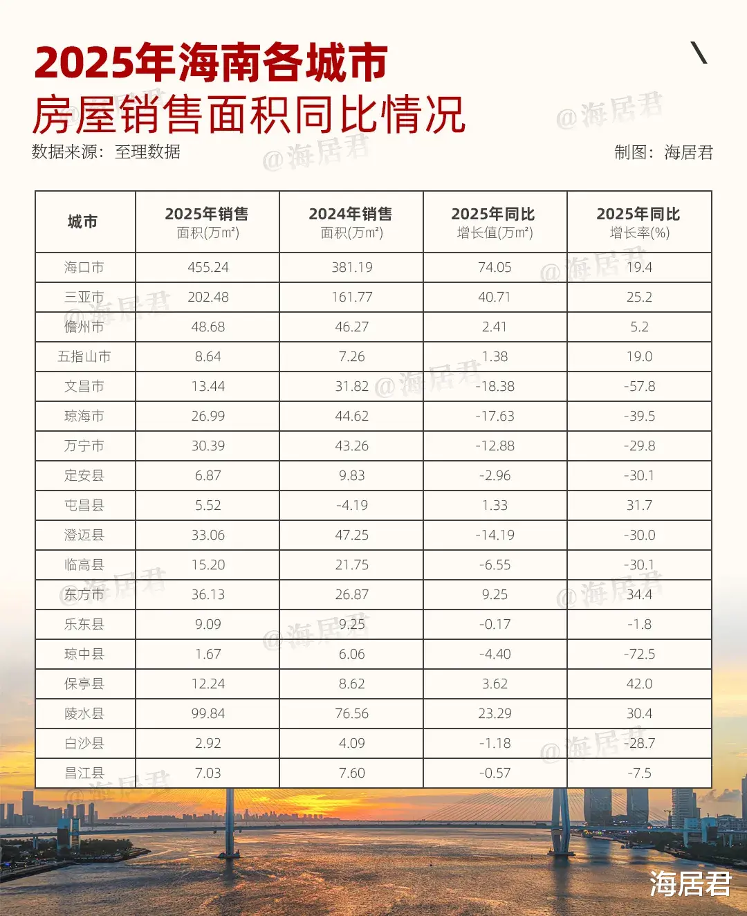 除了海口、三亚,2025年房屋销售面积同比增长的还有陵水、东方、保亭、儋州、五指山、屯昌等六座城市,其中陵水销售99.84万方,同比增长23.29万方。
