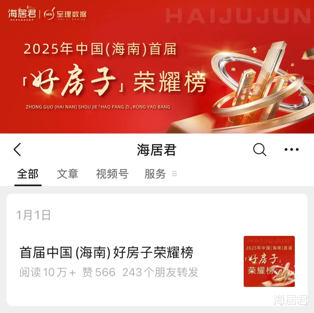 海居君携手海南权威研究机构至理研究院发布首届中国(海南)好房子荣耀榜,该榜单文章收获10万+🔥阅读,足以说明市场对海南自贸港“好房子”的关注。