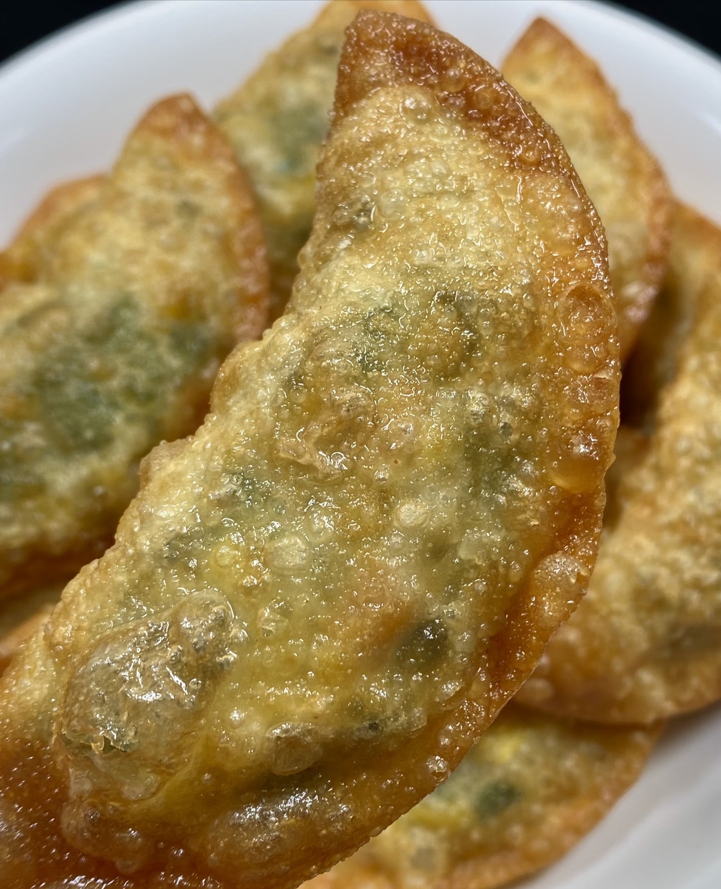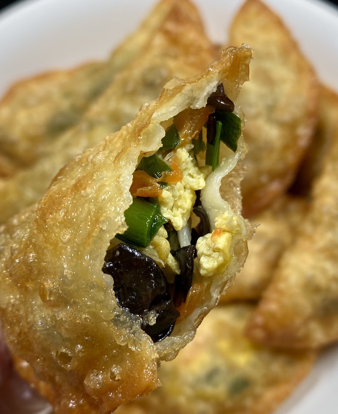 刚出锅的油角烫得直冒热气,但那股香味实在让人忍不住!咬开咔嚓一声,外皮薄如蝉翼却酥到掉渣,内馅鲜香多汁,韭菜的清甜、鸡蛋的绵软、虾米的鲜美在嘴里层层绽放,简直幸福到转圈圈!