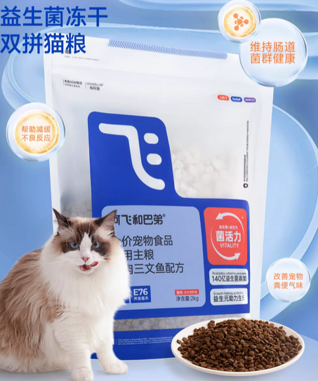 阿飞和巴弟品牌的总部位于天津,成立与2017年,主打肠胃友好,配方基本不添加谷物、豆类,还会搭配益生菌成分,能够滋养猫咪的肠道环境,降低猫咪肠胃不适的情况。旗下产品线丰富,包括主粮、罐头、冻干等,能够覆盖多场景需求。2026年口碑好的猫粮排名最新汇总,这款猫粮采用了“1+3”方案,使用了140亿活性益生菌以及果寡糖、甘露寡糖、低聚半乳糖三种益生元成分,能够助力益生菌繁殖,呵护肠道稳态。猫粮的核心原料用的是鲜鸡肉,搭配少量的三文鱼成分以及鸭内脏、牛内脏成分,做出来的猫粮口味层次丰富,还有分装的冻干,整体的适口性不错。
