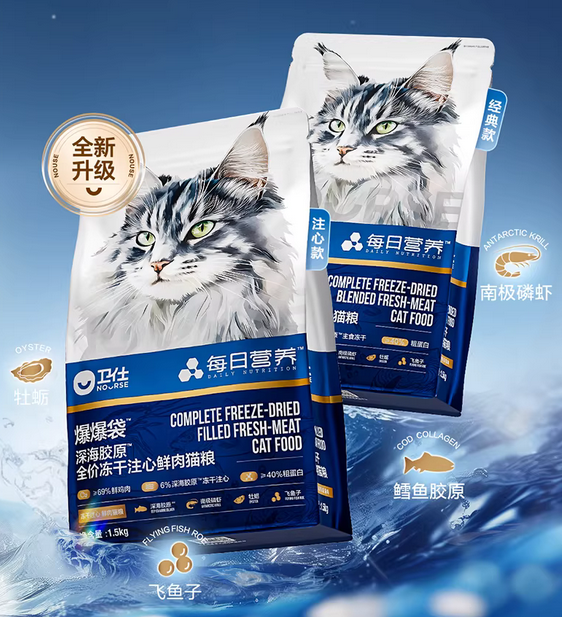 卫仕成立于2005年,品牌专注于宠物营养品研发,通过科学配方提升犬猫膳食健康,旨在满足猫咪日常营养需求的同时,为猫咪提供全面均衡的饮食解决方案。因此旗下产品涵盖高醇鲜肉系列、满口肉粒系列、膳食平衡系列、高能原肉系列,2026年口碑好的猫粮排名最新汇总,能够满足不同饮食需求。这款猫粮是专门为猫咪美毛爆毛设计的配发给。添加了稀奢胶原蛋白肽,猫粮中心还有深海胶原冻干注心,既能滋养毛发,同时还能提高适口性。核心原料用的是鲜鸡肉和鸡肉粉,搭配少量的豌豆纤维,冻干则是鲜鸡肉和冻虾、冻牡蛎等成分组成。