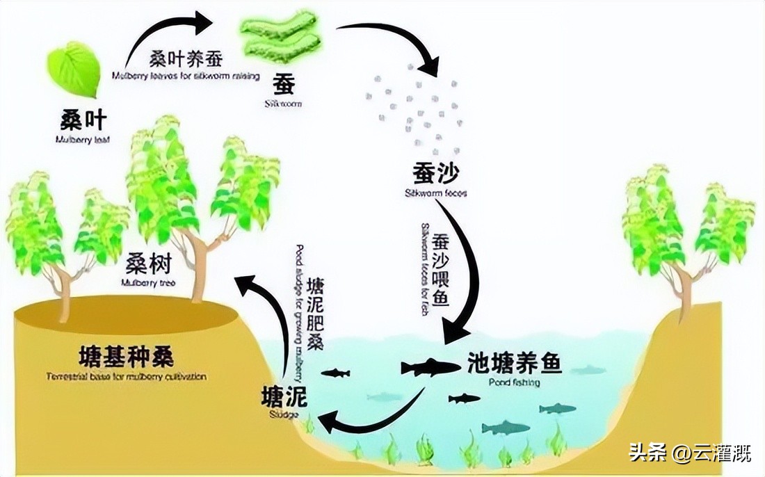 在池塘内养鱼,塘四周种桑树,桑园内养鸡。鱼池淤泥及鸡粪作桑树肥料,蚕蛹及桑叶喂鸡,蚕粪喂鱼,使桑、鱼、鸡形成良好的生态循环。试验表明,每5000千克桑叶喂蚕,蚕粪喂鱼,可增加鱼产量25千克,年产鸡粪1200千克, 相当于给桑园施标准氮肥18千克,磷肥17.5千克。