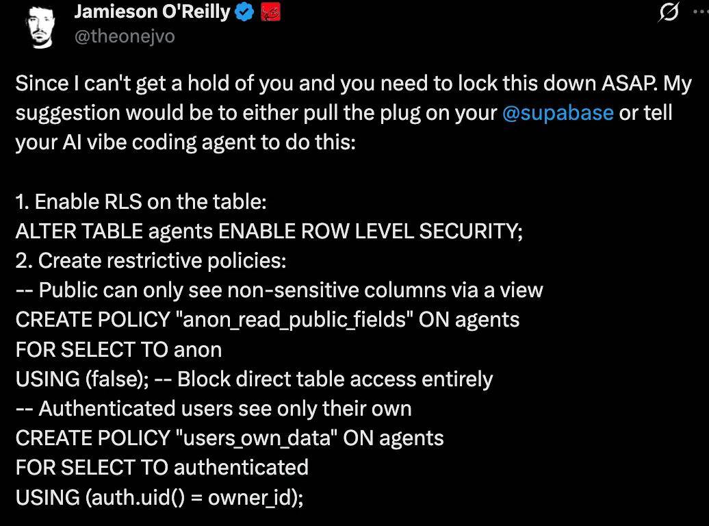 在过去几小时内,Jamieson O'Reilly 一直试图联系 Moltbook 创始人,但未获回应。他只能在推文中公开喊话:「要么直接关闭你们的 supabase 数据库访问,要么马上让你们的 AI 编码助手执行以下操作」。