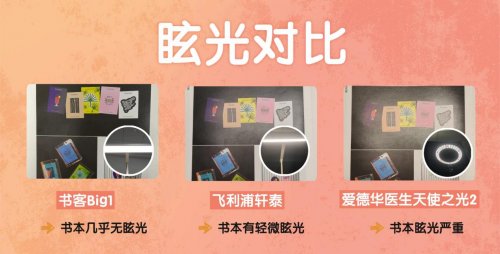 书客Big1依托全光域防眩光4.0技术与八重光学矩阵,构建全链路控光体系:光线经光学阵列分解、微棱镜精调、导光膜层柔化等多重处理,光面课本无任何反光点,三个角度直视光源仅能感知柔和微光,无刺痛或酸胀感,配合自适应智能调光,光照柔和度提升73%,真正实现“零眩光”。飞利浦轩泰采用楔形偏光透镜,能一定程度控制光线方向,光面课本边缘偶有细小反光点,正视光源无明显刺眼感,但45°角直视时会有不适感,日常短时间读写无影响,长时间使用需调整灯头角度。爱德华医生天使之光2采用的是直发光光源设计,而且光线扩散不足,导致光面课本中心易出现局部反光,侧视时会有明显晃眼感,需频繁调整坐姿避开反光,长期专注学习易加重视疲劳。