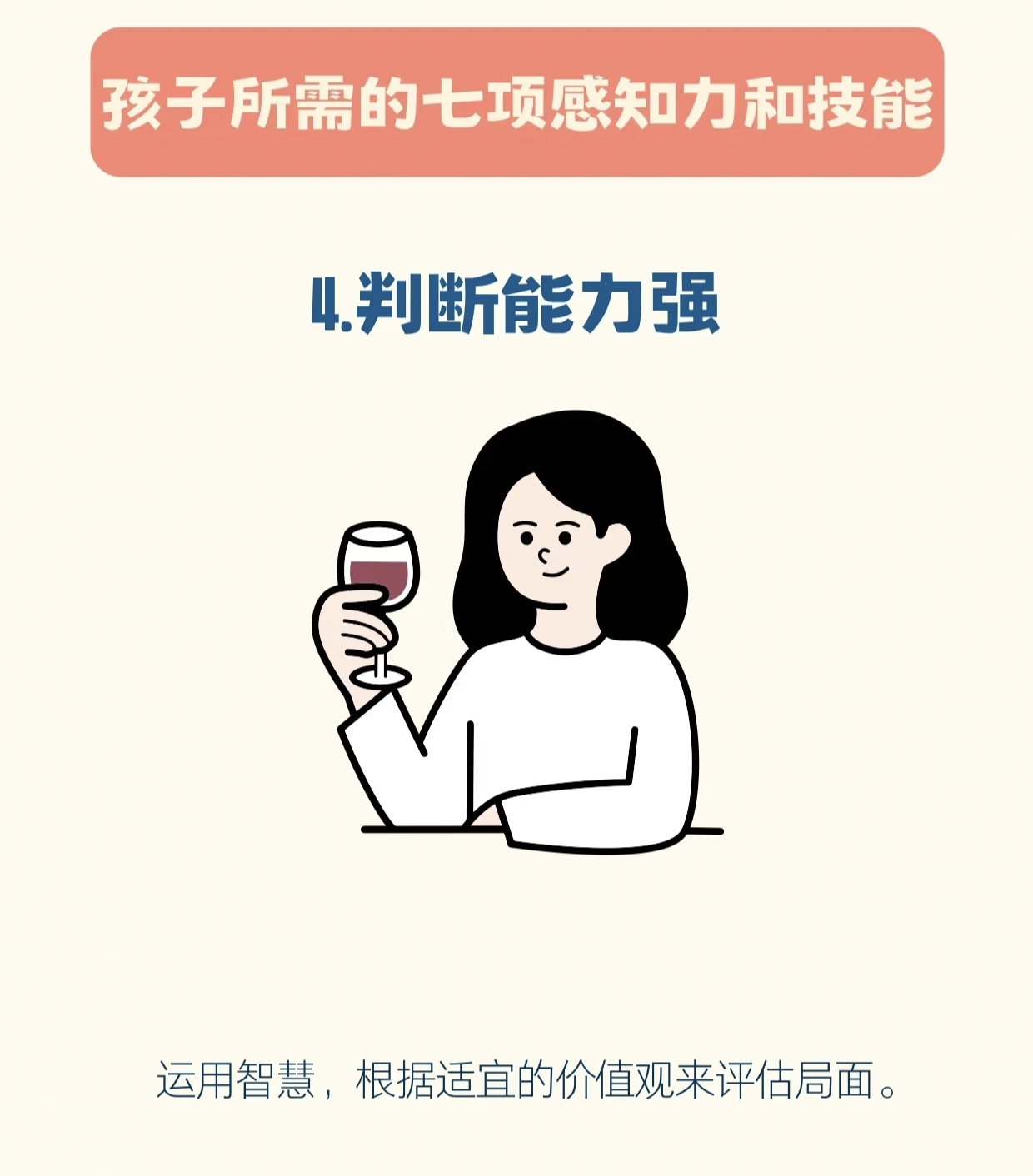 7. 判断能力(价值观):这是最高级的能力。他能根据自己的价值观去评估局面,做出正确的选择。比如,面对诱惑时,他能判断什么是对错,而不是随波逐流。
