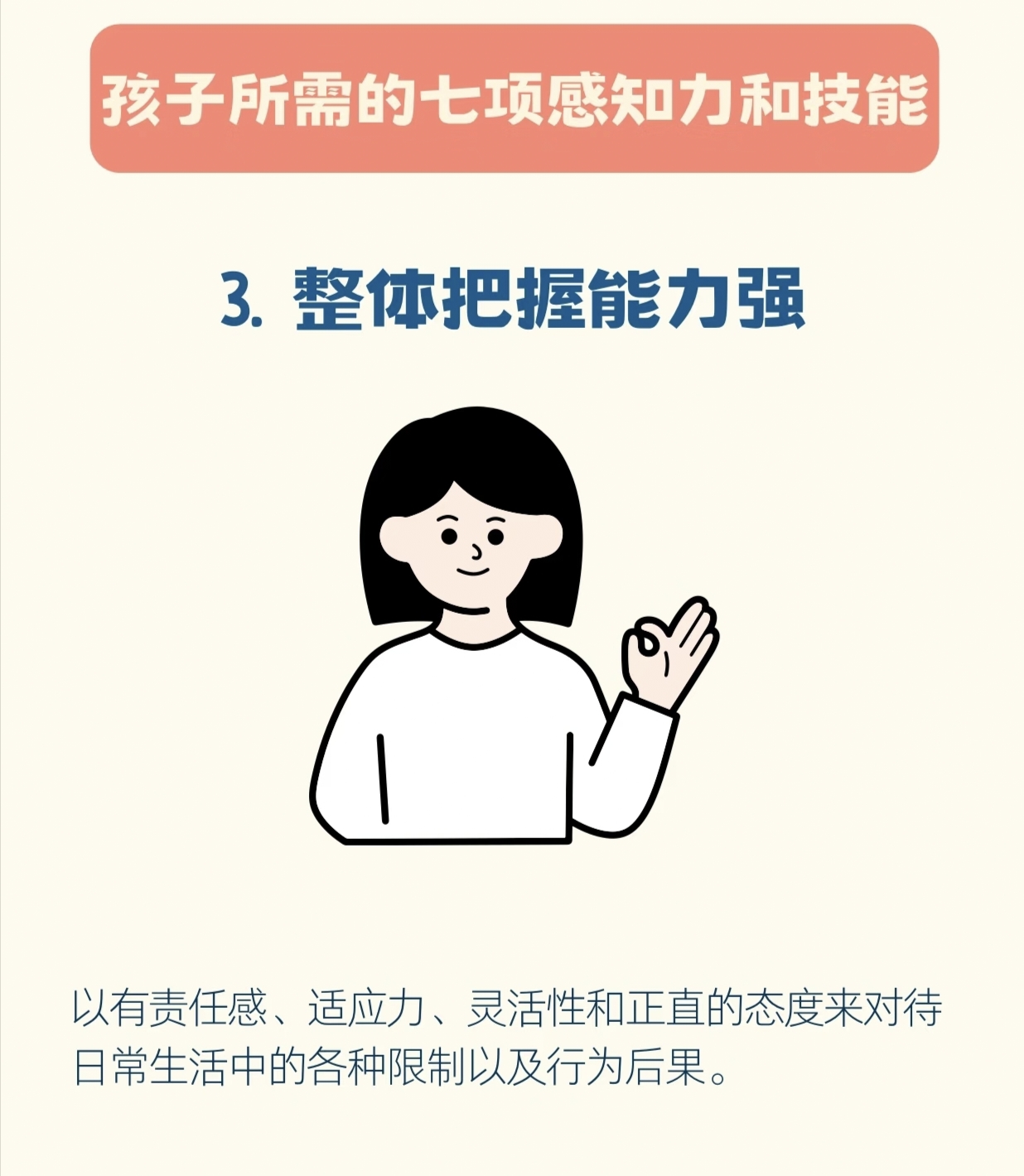 6. 整体把握能力(责任感与适应力):面对规则和限制(比如作业没写完就不能看电视),他能承担责任,灵活调整自己,而不是抱怨环境或钻牛角尖。