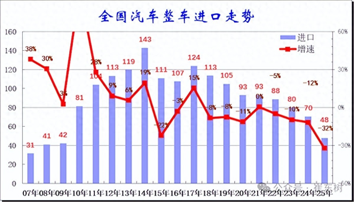 2023年,进口车销量锐减至80万辆,同比下降10%;2024年进一步降至70万辆,跌幅扩大至12%;2025年的32%跌幅,让进口车市场规模缩水至峰值的三分之一左右。