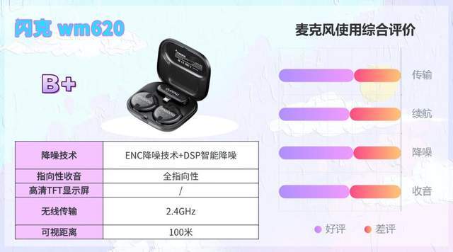 综合实力评价:适配多数主流手机、相机,即插即用,单人或双人拍摄设备搭配方便。支持一拖二收音,双人场景无需反复摘戴设备,使用灵活。8+12小时续航满足半天高强度拍摄无压力,无显示屏设计,参数需通过指示灯判断。