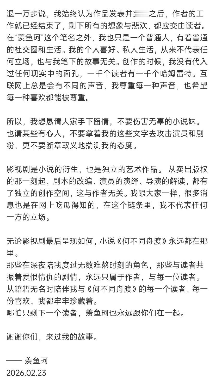 细看了一下作者的声明,她说的有些我还是非常赞同的,就是应该书剧分离啊。既然24年12月已经售出版权,那么电视剧要怎么改,想怎么改,她都无权干涉,书迷更加无权置喙。