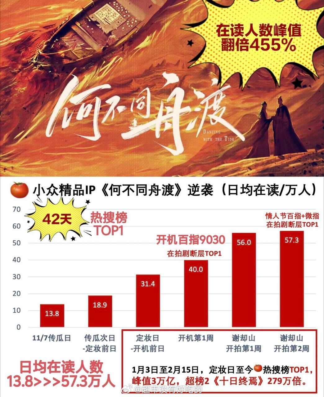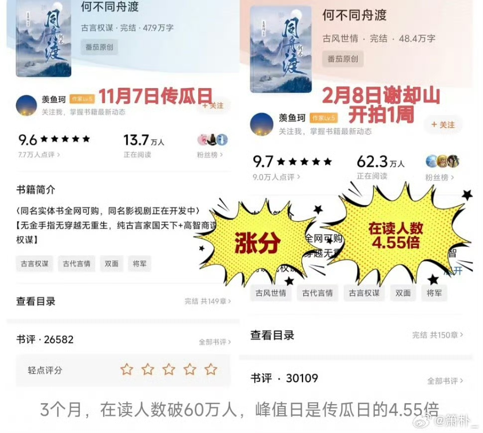 开机第一周,日均在读人数40万,翻倍290%!谢却山开拍第2周,日均在读人数57.3万,翻倍415%;开拍三周的在读人数峰值日为62.3万,翻倍455%。
