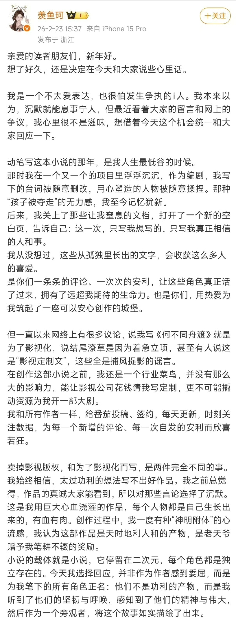 原本非常和谐的合作氛围,已经是影视化清流!作者发文这一出,没觉得是回应和说明,字里行间更觉得是想要热度和关注度 !