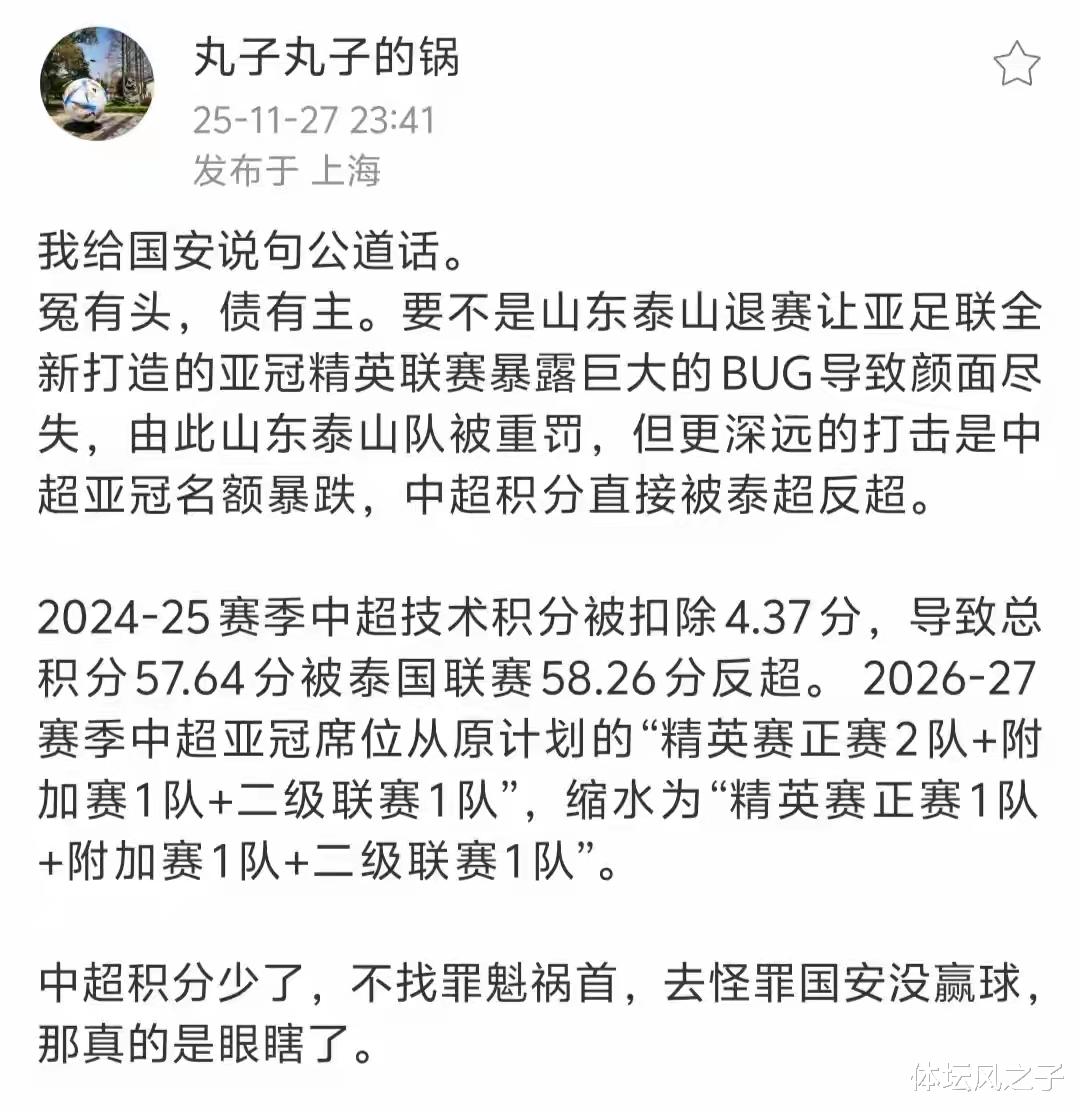 “丸子”在发声中力挺国安,直言要为其说句公道话。他将中超亚冠积分被泰超反超的主要责任,一股脑地归结到了山东泰山队身上,认为泰山队退赛才是导致这一局面的罪魁祸首。他言辞激烈地表示,中超积分减少,不去怪真正该负责的泰山队,反而指责国安没赢球,是“眼瞎”之举。从“丸子”的言论中不难看出,他试图将国安输球与中超积分被反超这两件事剥离开来。在他看来,国安的出局与中超积分减少并无直接关联,其他参加亚洲比赛且输球的球队也不应承担主要责任,真正该被问责的只有山东泰山队。
