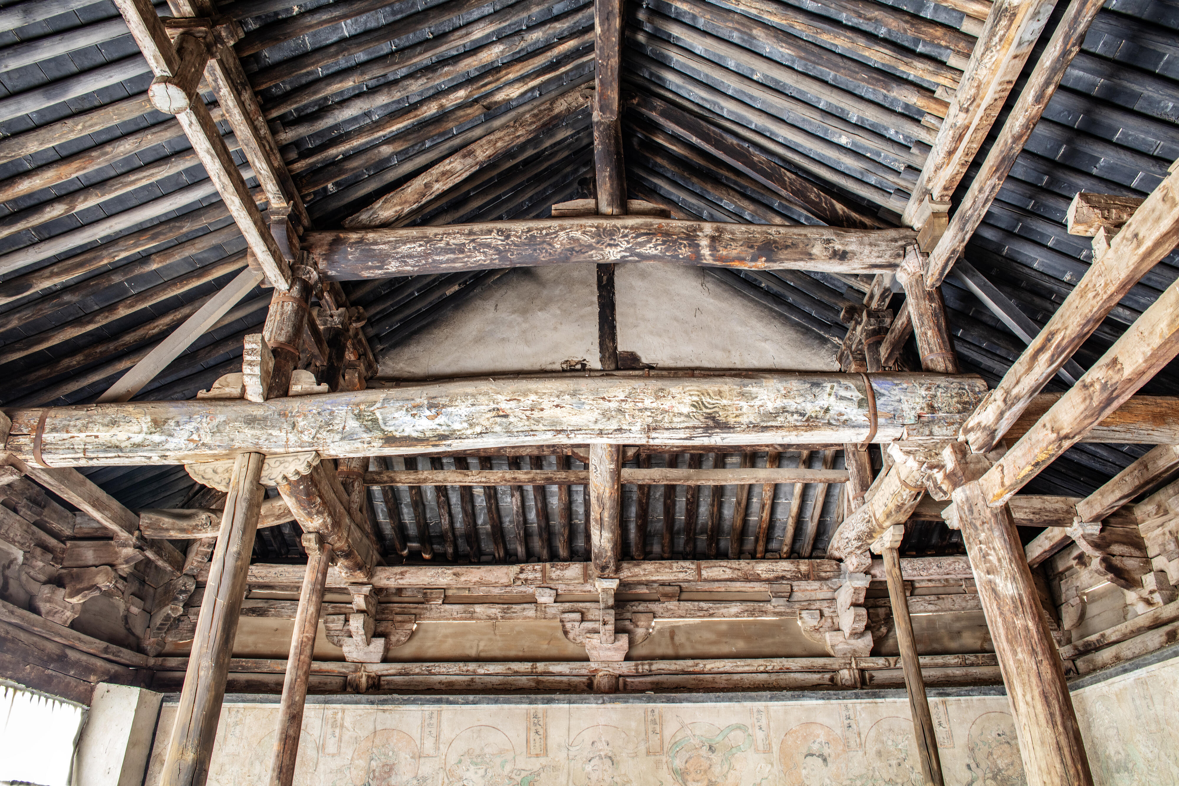 推开门走进殿内,光线骤然暗了下来,空气中弥漫着潮湿的木料气息。眼睛适应了片刻后,才看清殿内的梁架——三椽栿对劄牵的结构一目了然,通檐用三柱的设计让空间显得格外开阔。抬头看梁栿,上面还能隐约看到几处模糊的墨痕,像是当年匠人留下的记号。老人说,这些梁木都是宋代的原构,几百年来,它们默默支撑着这座大殿,抵挡住了无数次风雨侵袭。伸手轻触梁木,能感觉到木料的坚硬与厚重,那是时光赋予的力量,也是宋代营造技艺的见证。