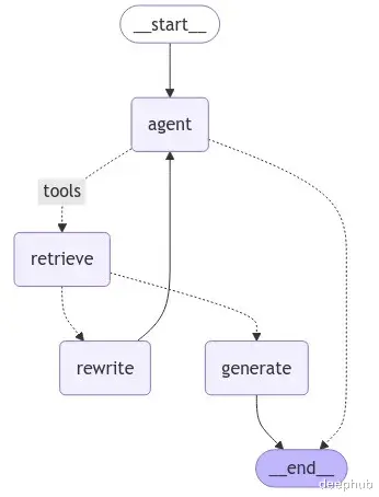 接线逻辑如下:查询先到智能体节点,智能体决定调检索器的话流程就到检索节点,检索完进评分,评分过了走生成,没过走重写,重写完的查询再回智能体重新来过。生成节点执行完流程结束。