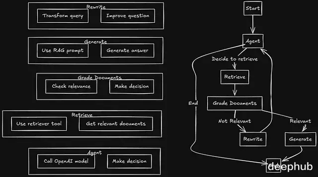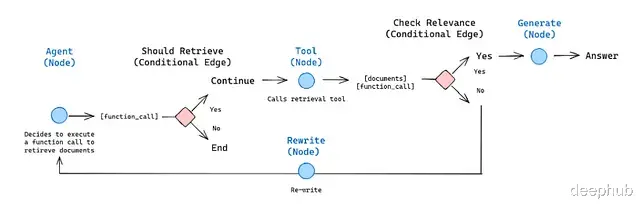 重写函数处理那些被评分环节打回来的查询。它会让 LLM 把原始问题改写成检索友好的形式,用词更精准、关键信息更突出。改写后的查询再交回智能体重新发起检索。