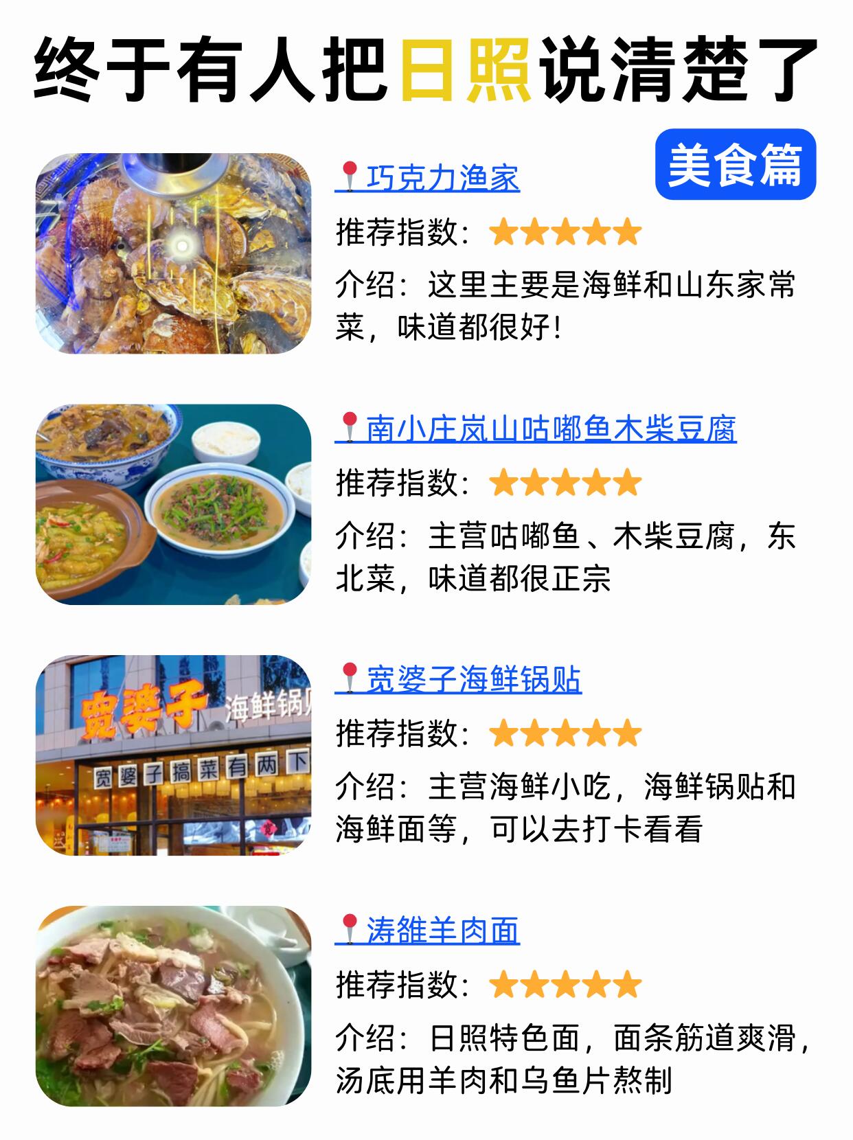 我去吃了好多家,只有这几家我的印象比较深刻:🔹巧克力渔家、🔹南小庄岚山咕噜鱼木柴豆腐、🔹宽婆子海鲜锅贴、🔹涛雒羊肉面,下次有来日照我还要来吃!