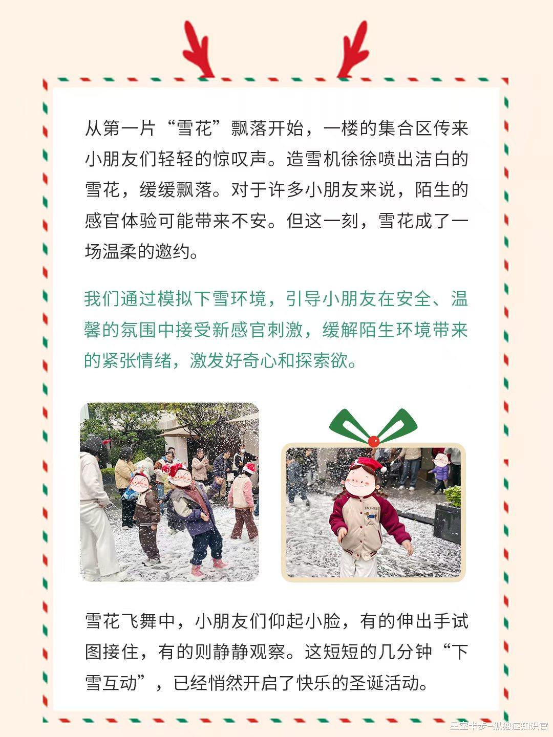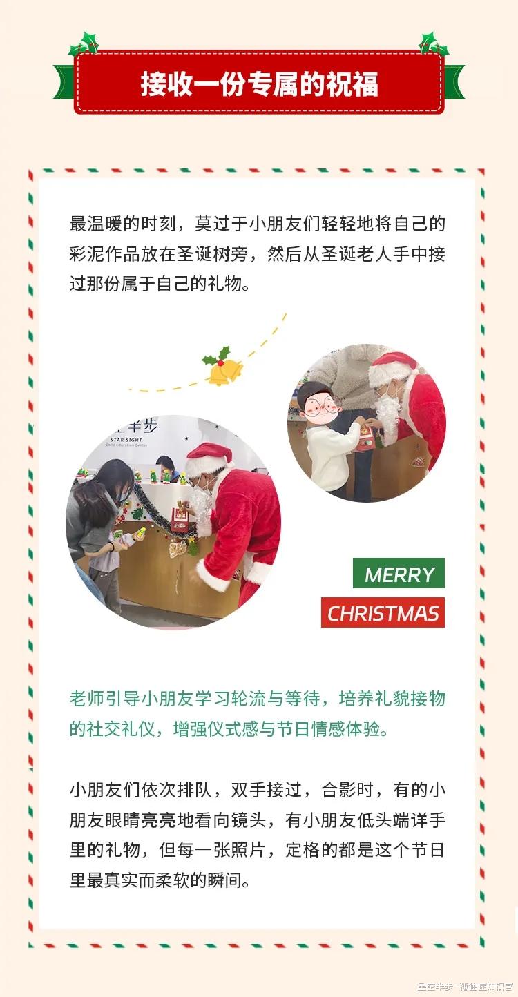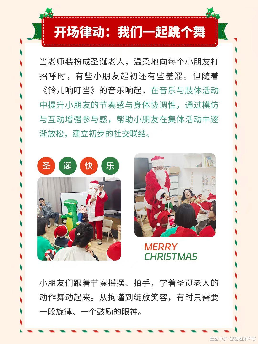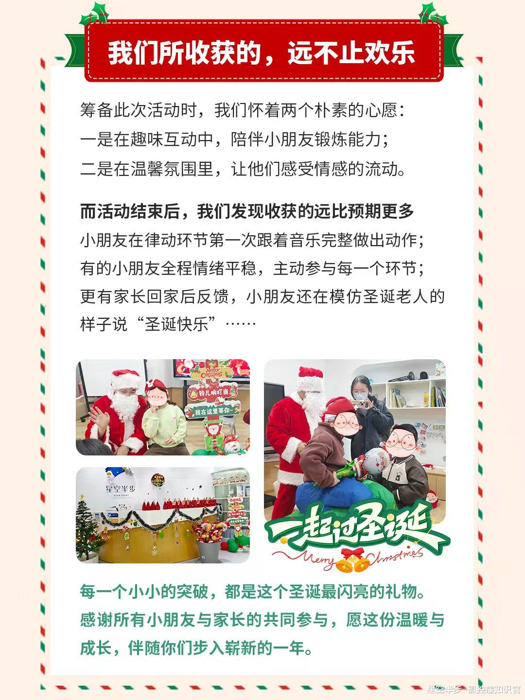 12月26日,星空半步为2-12岁特需儿童举办了温馨的圣诞活动。活动设置造雪互动、开场律动、彩泥手工、接收礼物、分享点心等环节,在安全有趣的氛围中,帮助小朋友缓解紧张情绪、提升节奏感与动手能力、培养专注力、社交礼仪及分享意识。活动不仅达成了锻炼孩子能力、让孩子感受情感流动的初衷,还收获了超出预期的效果,见证了孩子们的诸多小突破。