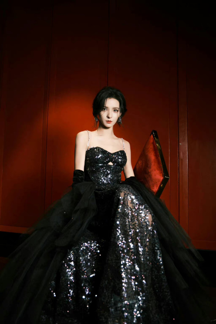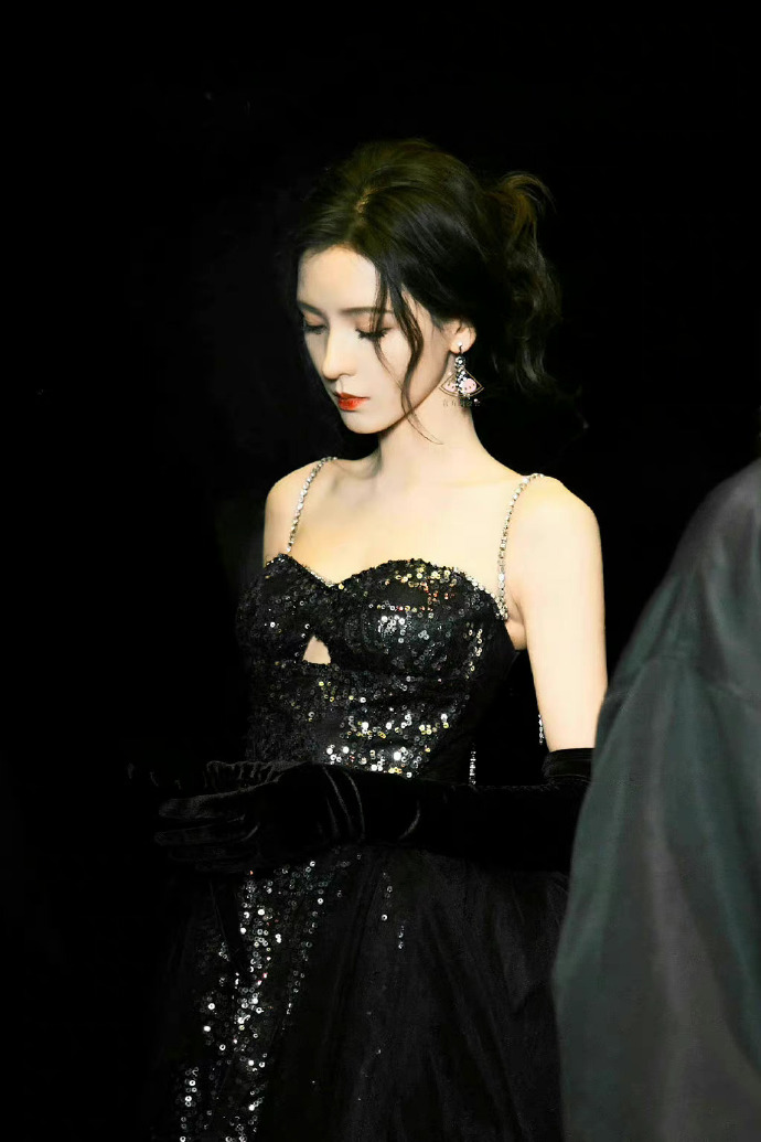 礼服上,每一片亮片都像是精心雕琢的梦境,闪烁着神秘而迷人的光芒。吊带设计,完美勾勒出她纤细的肩颈线条,美得让人心动不已!而那拖地的裙摆,如同夜色中的涟漪,每一步都摇曳生姿,尽显高贵与典雅!