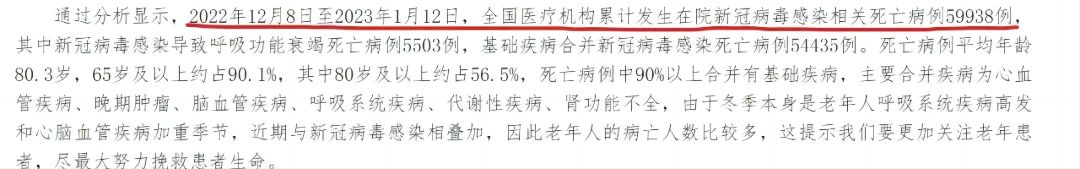 而在今年1月14日,国务院联防联控机制新闻发布会发布,“ 2022年12月8日至2023年1月12日,全国医疗机构累计发生在院新冠病毒感染相关死亡病例59938例,其中新冠病毒感染导致呼吸功能衰竭死亡病例5503例,基础疾病合并新冠病毒感染死亡病例54435例。”这是中国首次发布自开放以来,一个月内,近6万人死于新冠的官方数据。另据中疾控公布的数据,自四月份以来,新冠死亡人数已有至少五周为零死亡。