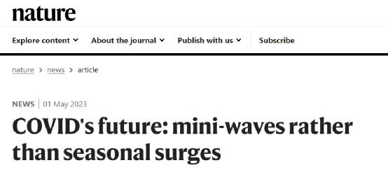“灭绝”(Extinction):即便是保存在最高等级实验室里的病毒样本也已被销毁(举例:无)。以COVID-19新冠疫毒为例,WHO于2020年1月30日第二次会议上宣布COVID-19(2019-nCoV)构成PHEIC,于2020年3月11日宣布Pandemic。要强调的是,本次世卫结束的是新冠紧急状态,但并未宣布Pandemic(大流行)完结。▎5月1日,nature杂志发表了一篇题为COVID's future: mini-waves rather than seasonal surges的文章,该文指出在新冠疫情暴发三年之久后,新冠病毒并没有像流感那样进入季节性传播的模式,相反,其未来可能会进入小规模的波浪式反复流行模式