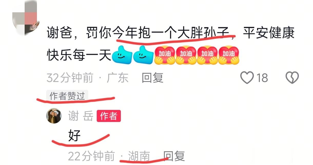 有人在谢岳的视频下留言说:罚你今年抱一个大胖孙子,平安健康,快乐每一天!