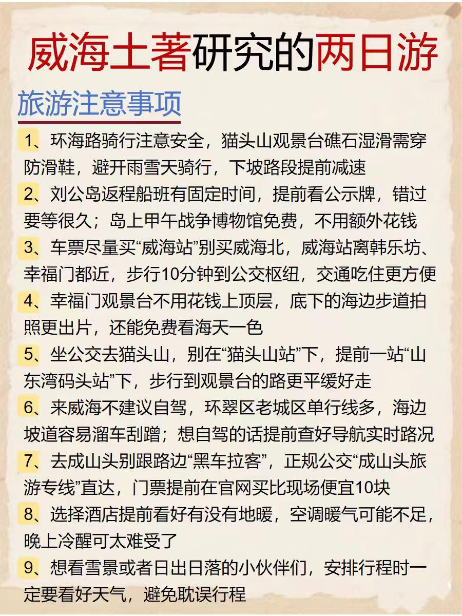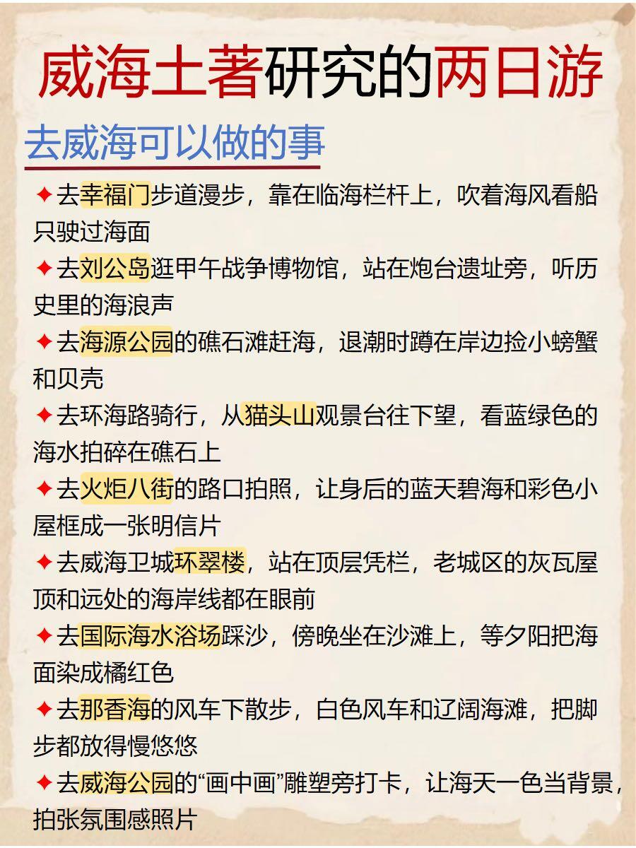 ❄️我们是在威海站🚉下车,找了个行李寄存🛅,就开始玩喽。第一站悦海公园⛲️,去找秋千拍照📷,大海🌊为背景人坐在秋千上面拍,好出片。第二站威海公园,大相框就在这里,大家记得找它合照哦。沿着步道走20分钟吧就到幸福门啦,威海地标很显眼。上去需要买票🎫,我们在下面转两圈拍拍照就打车去刘公岛啦。🎫122r包含来回船票,不管是岛上风景很漂亮,里面jia午战争纪念馆很有意义。接着出发海源公园,这个倒是出乎意料的喜欢💕,人少景美,好适合慢悠悠闲逛🚶♀️➡️。去半月湾看日落🌅,不愧被称绝美海湾,看👀一百遍都不会腻!