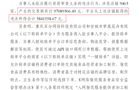 再说回到拼多多,根据行政处罚书,拼多多是通过与“重庆百分网络科技”等转单平台合作,实现“一键转单”。而平台上的九千多家店铺,所产生的交易额高达9708.93万元,拼多多则从中获利超过584万元。