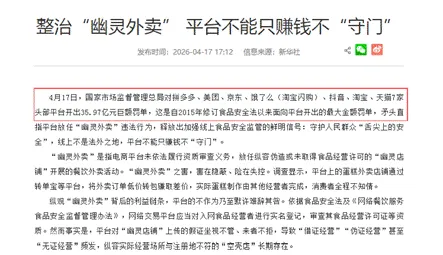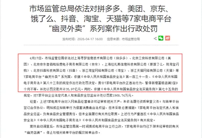 4月17日,国家市场监管总局就“幽灵外卖”系列案,对拼多多、美团、京东等7家头部电商平台作出了行政处罚。