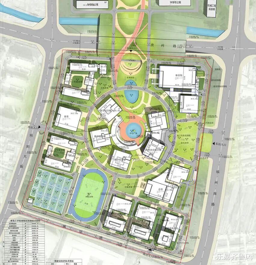 青岛工学院南校区总用地面积185606.14㎡,总建筑面积233456.35㎡,包括教学综合楼、图书办公综合楼、体育馆、会堂、食堂、2栋宿舍楼、2栋产教融合楼、学术交流中心等,容积率1.1,绿地率35%,停车位661个,地上77个,地下584个。