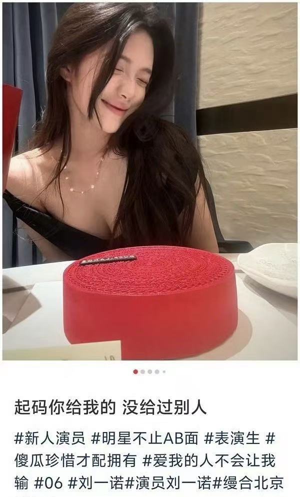在刘一诺的公开恋爱记录里,有几张很引人注目的照片。一张是她拿着卡地亚在炫耀,如果大家知道这是谁送给她的,一定会很羡慕她并说她命好。