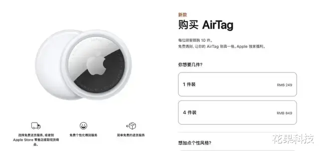 新一代 AirTag 加量不加价,售价和上一代保持一致。1 件装售价 249 元,4 件装售价 849 元。