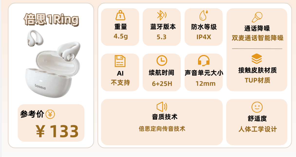 倍思1Ring采用通用的人体工学设计,配合TUP材质,提供了基础的佩戴舒适度。其单耳重量仅约4.5克,是本次对比中最轻的型号之一,实现了近乎无感的佩戴体验,非常适合作为日常辅助耳机长时间佩戴。倍思1Ring搭载12mm动圈单元并应用倍思定向传音技术,其声音表现以满足清晰人声和通话为主要目标。