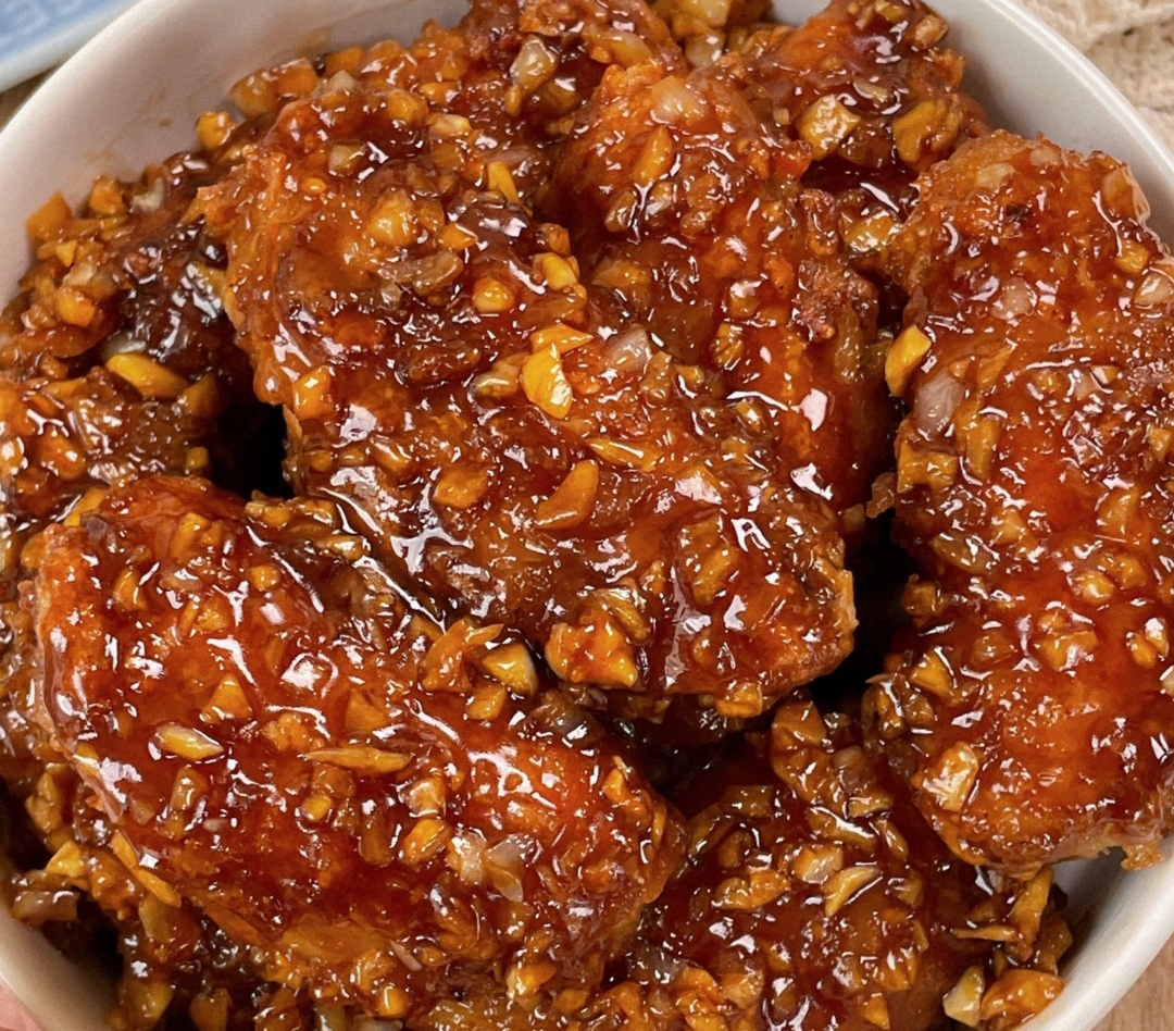 最后是融合风味的炒制:锅内留底油,放入足量蒜末,以小火慢慢煸炒,直至蒜香四溢、色泽微黄,此时加入一勺生抽,激发出酱香的瞬间,随即倒回煎好的鸡翅快速翻炒,让蒜香酱汁均匀包裹。最后加入一勺蜂蜜,蜂蜜遇热融化,迅速裹上鸡翅,形成晶莹透亮的琥珀色,翻炒均匀即可出锅。