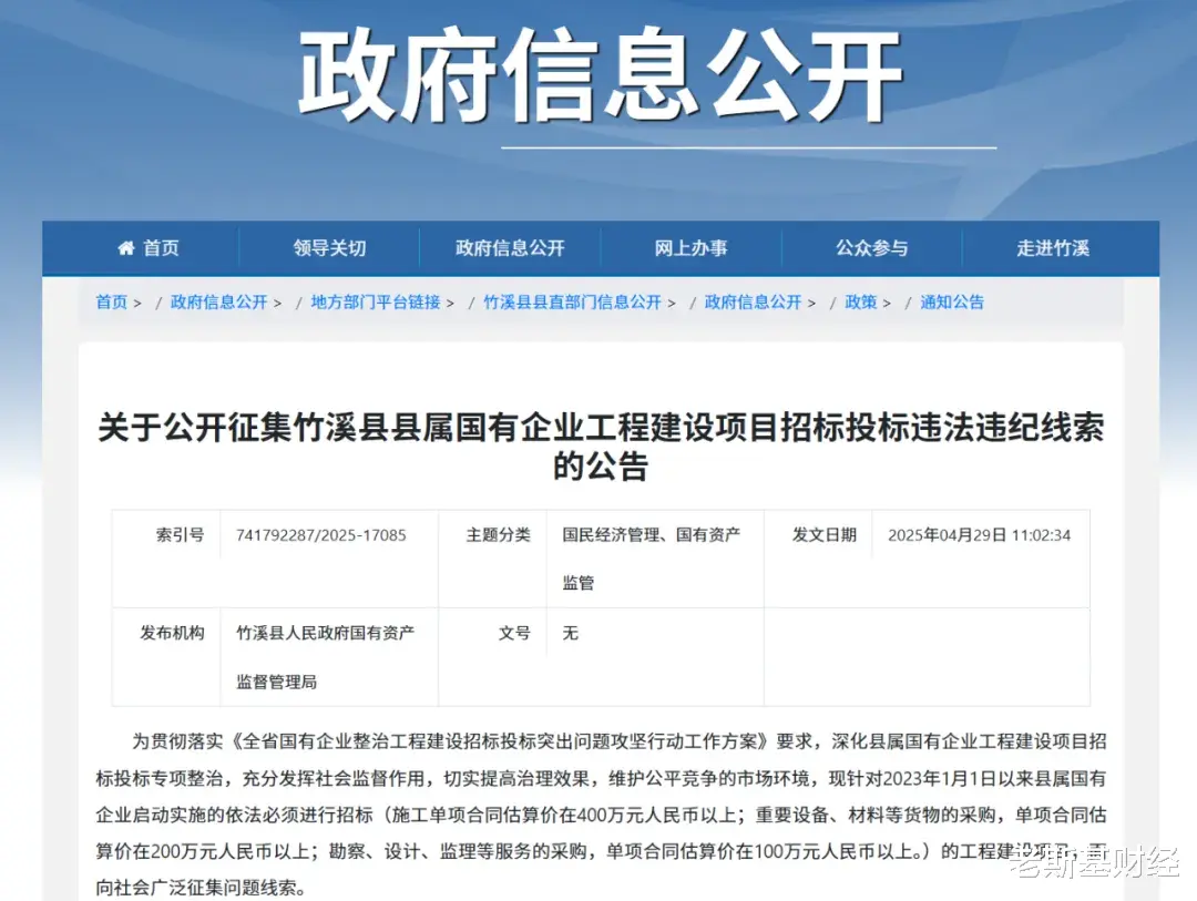 今年4月份,竹溪县还专门公开征集竹溪县县属国企的工程建设项目招标投标违法违纪线索。